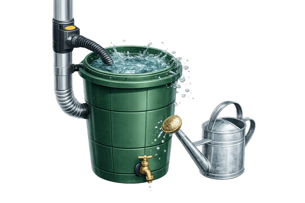 Sammelt Regenwasser vom Dach und macht es kostenlos für die Gartenbewässerung nutzbar – ganz ohne zusätzlichen Verbrauch aus der Leitung.